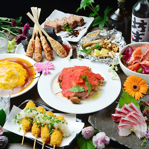 ヤングコーンバター焼き 旬魚のお刺身 豆富の棒々鶏サラダ 鶏串カツ 幻の手こねつくね串 奥三河鶏の照り焼き チリマヨソース 鶏そぼろ飯 ピーチケーキ ※金土祝前日は2時間制(+500円で3時間制に)!8名様毎に1名様無料! ※仕入れ状況により料理内容が予告無く変わる場合がございます。 ※チャージ代含む。