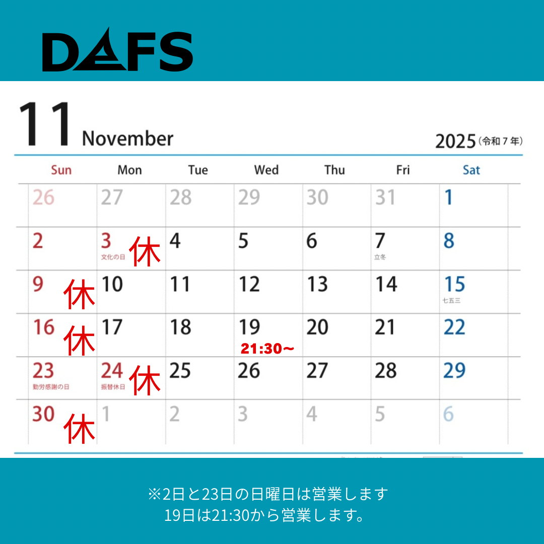11月の休みです。 2日と23日の日曜日は営業します。 19日は21:30から営業します。 よろしくお願いします。