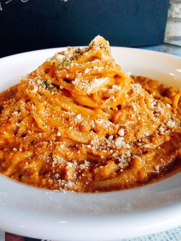 モチモチの生パスタ使用。温玉のせです。 ハーフサイズ680円。