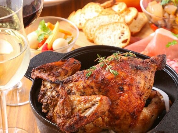【前菜盛り合せ】 クリームチーズの蜜りんご醤油漬け まるみ豚生ハム 旬野菜のフリッタータ 季節野菜のピクルス のらぼう菜のマリネ 【サラダ】 春野菜のサラダ 【アヒージョ】 桜エビとゴボウ、新じゃがのアヒージョ 峰屋バケット 【メイン】 東京オーブン名物ローストチキン