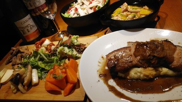 【前菜盛り合せ】 クリームチーズの蜜りんご醤油漬け まるみ豚生ハム 旬野菜のフリッタータ 季節野菜のピクルス のらぼう菜のマリネ 鱈のガーリックポテトディップ 【サラダ】 春野菜のサラダ 【アヒージョ】 桜エビとゴボウ、新じゃがのアヒージョ 峰屋バケット 【メイン】 宮崎まるみ豚ステーキ 東京オーブン名物ローストチキン