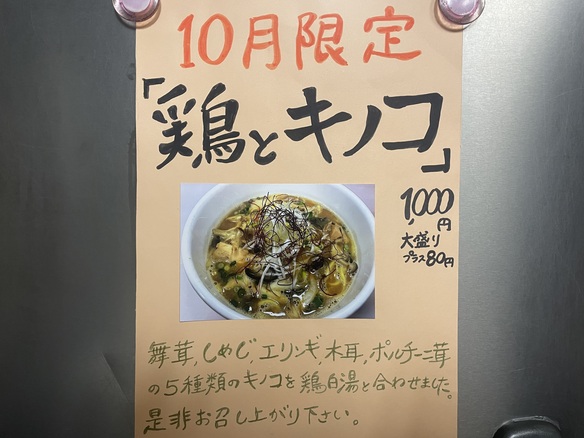 舞茸、しめじ、エリンギ、木耳、ポルチーニ茸の5種類のキノコを鶏白湯と合わせたラーメンです。