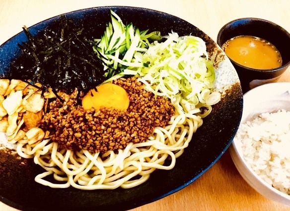 まぜそば、半ライス、あっさりスープのセットです。 ※麺中盛り無料(お声掛け下さい)