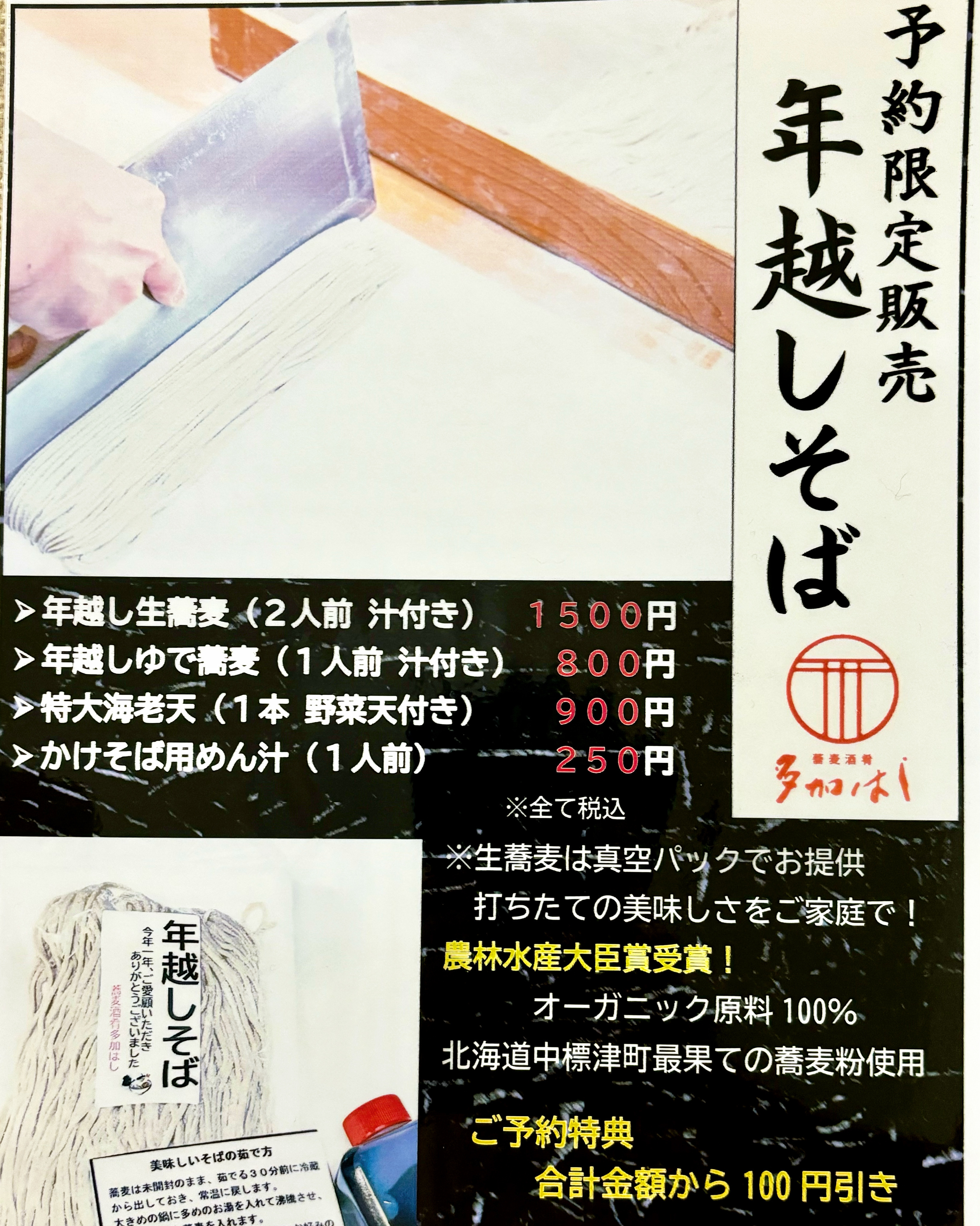 30・31日は11:00〜21:30の営業となりますが、お蕎麦が無くなり次第終了となりますのでご了承下さい。また、メニューも通常とは違い、種類を制限しておりますのでご了承下さい。