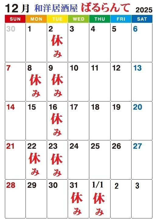 ※ 和洋居酒屋 ばるらんて8月定休日案内 ※