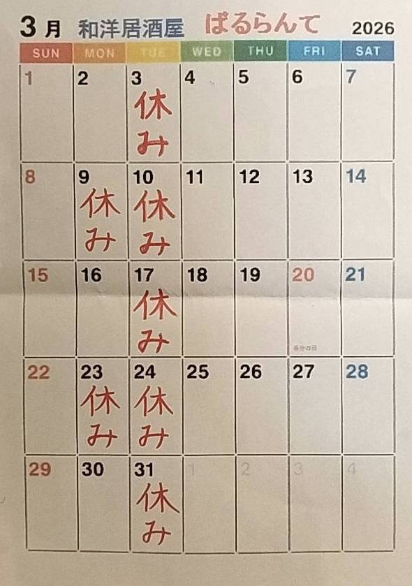 ※ ばるらんて3月の定休日ご案内 ※