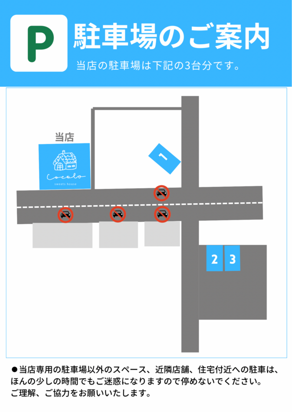小さなお店で駐車スペースが少なく、お客様にはご迷惑をおかけいたしますが、ご理解ご協力の程よろしくお願いいたします。