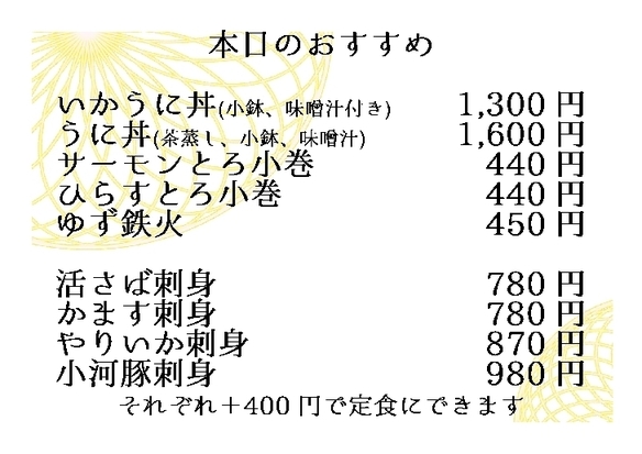 ネタがなくなり次第閉店となりますので閉店時間が早くなる可能性があります。ご了承くださいませ。