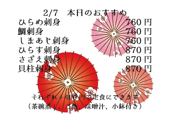 今日も新鮮なお魚を仕入れております。人気の貝柱、ひらすに加えさざえも入荷しております。