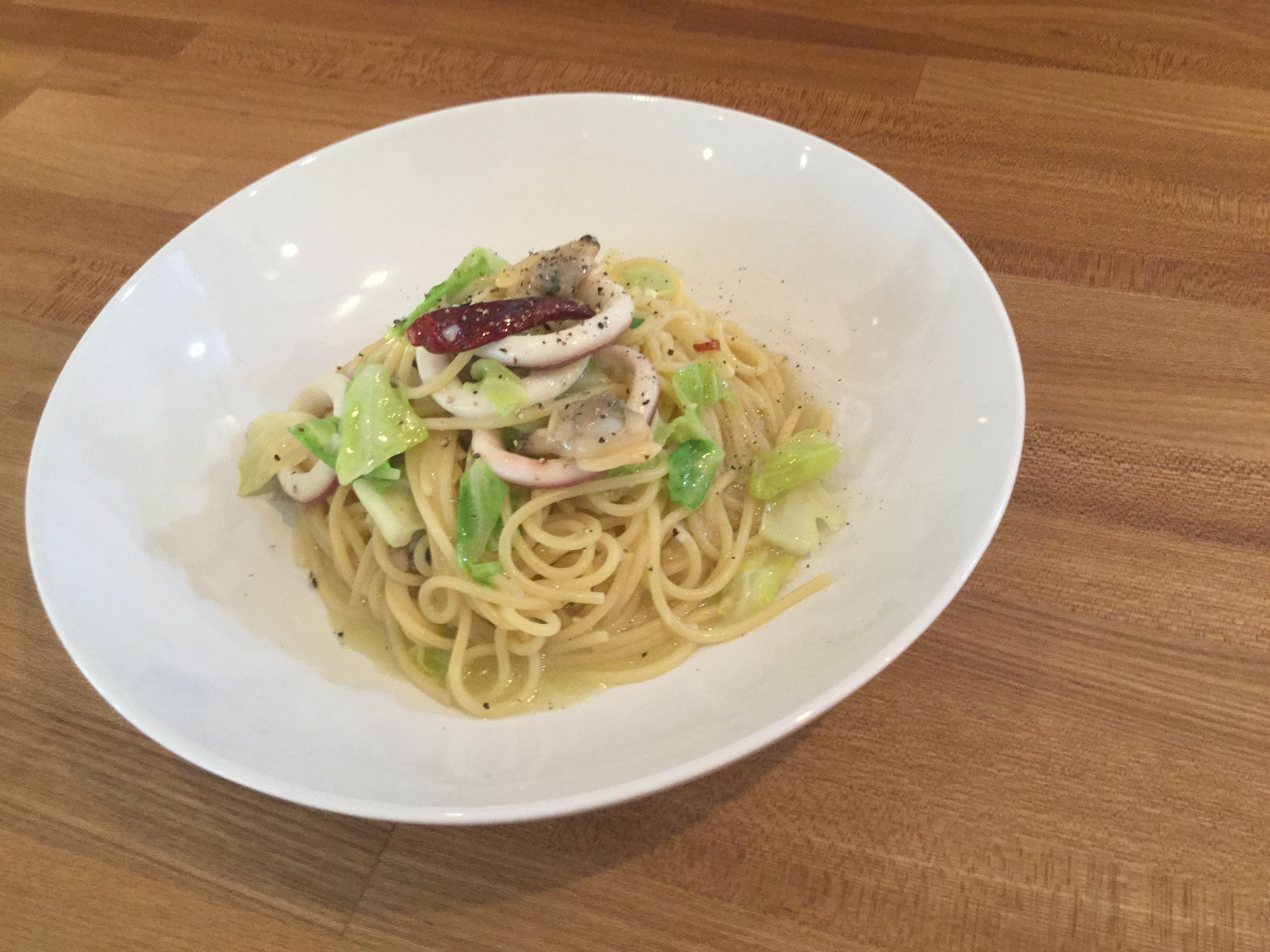 本日、8(日)の日替りランチパスタは、魚介と白菜のアーリオ・オーリオです🦑