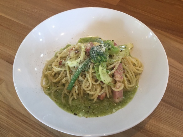 本日、2/1(金)の日替りランチパスタは、2月のスタートという事で大サービス!!厚切りベーコンとインゲンのジェノベーゼパスタです(≧∀≦)