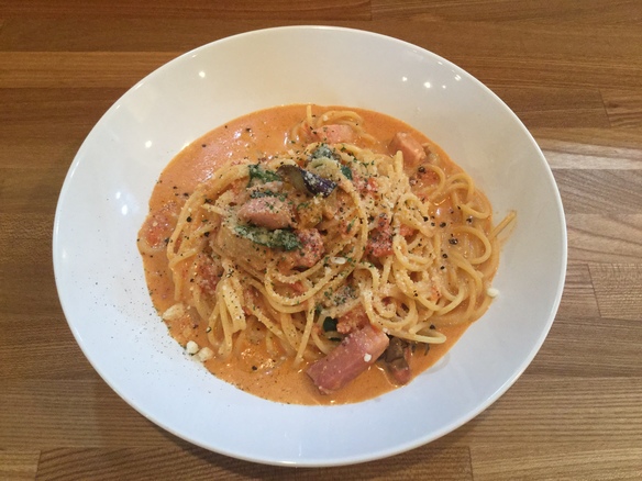 本日、9(金)の日替りランチパスタは、厚切りベーコンのトマトクリームパスタです!!