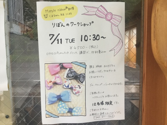 それと、7月11日(火)の10:30〜くまちゃん先生によるリボンのワークショップを開催しま〜す!!もちろん、OTTOのスペシャルランチ&ドリンク付き!ご希望に合わせてゴム、クリップ、バレッタが作れます!!
