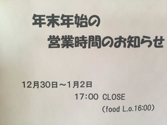 明日から1月2日まで短縮営業(17時閉店)となりますので夜の営業は今年最終日です!皆様のご来店お待ちしてまーす!!