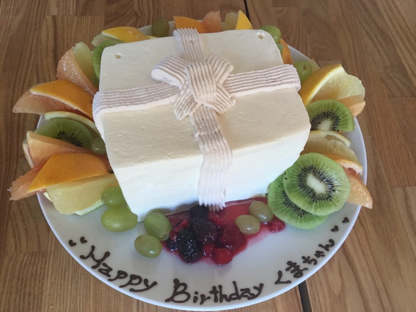 プレゼント型のケーキの中は4段のショートケーキでした。