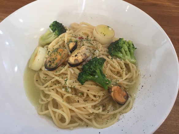 本日の日替りパスタはムール貝とブロッコリーの塩パスタです。