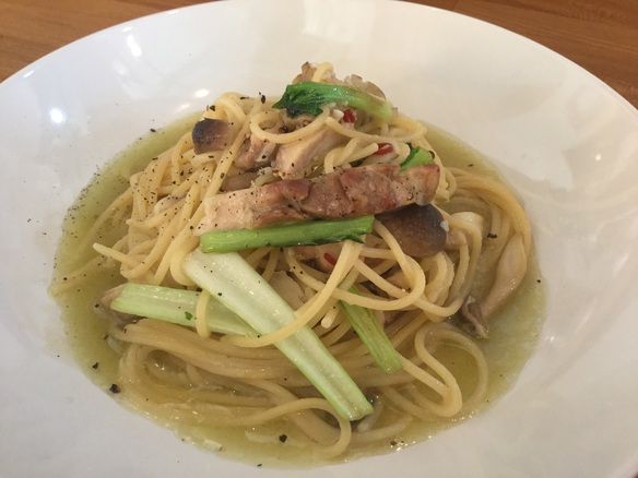 本日の日替りパスタはチキンの塩ガーリックパスタです。