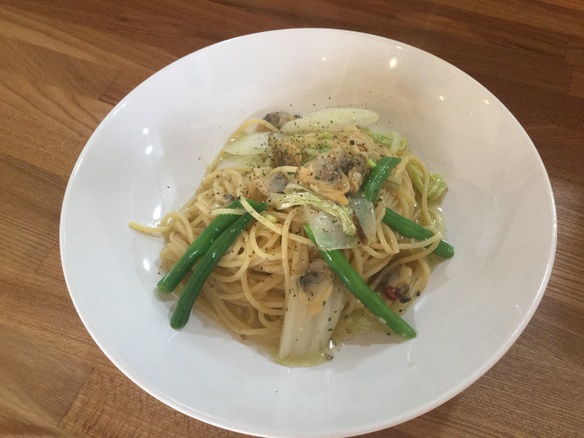 本日のパスタは、あさりとインゲンの塩ガーリックパスタです。
