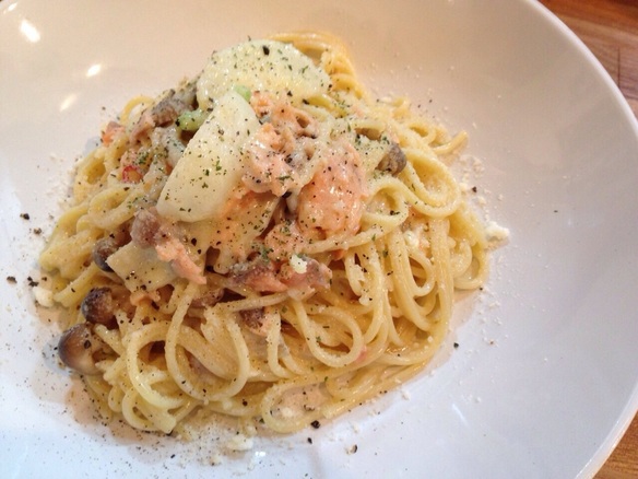 本日のパスタはサーモンとかぶのクリームパスタです。
