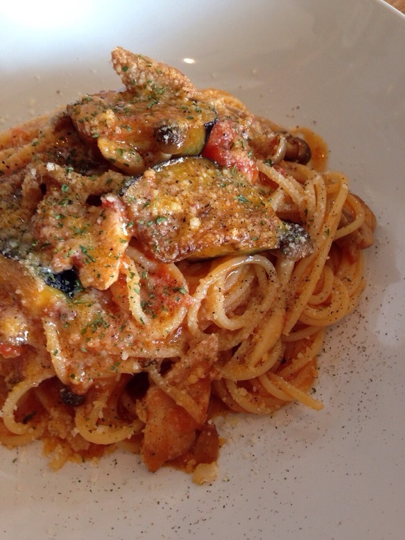 本日の日替わりパスタは『チキンとしめじのトマトソースパスタ ¥830』です。茄子も入ってボリューム満点のランチを是非ご賞味ください。。