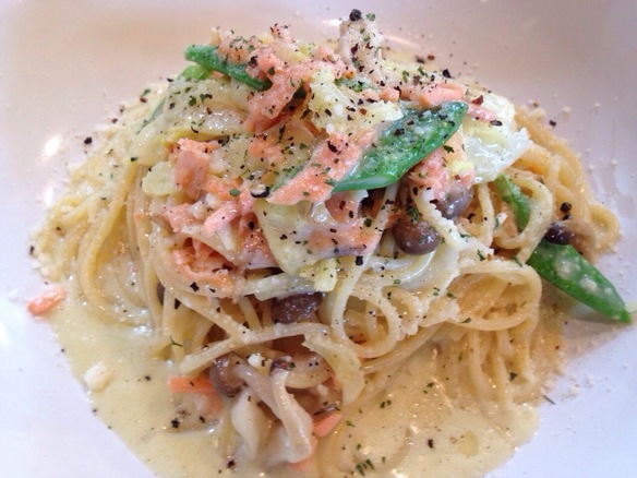 さて、本日の日替わりパスタは『サーモンのクリームパスタ ¥830』です。サーモンとクリームの体温まる組み合わせに、モロッコインゲン・しめじ・キャベツと具沢山にしてあります。ぜひお試しください!