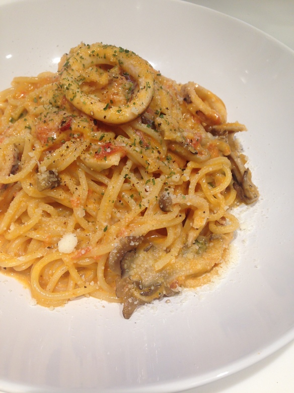 本日の日替わりパスタは『いかとキノコのトマトクリームパスタ ¥830』です。
