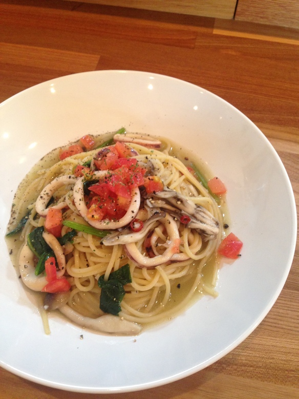 本日の日替わりパスタは『いかとフレッシュトマトの塩ガーリックパスタ ¥830』です。
