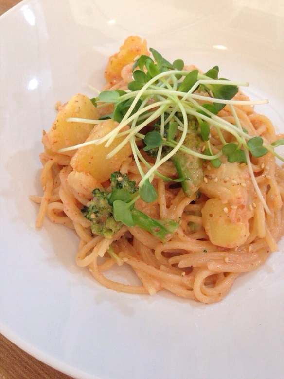 あいにくの空模様ですので、ランチパスタくらいは鮮やかで晴れやかな気持ちになるようにピンク色でご用意いたしました。ぜひお試しください。