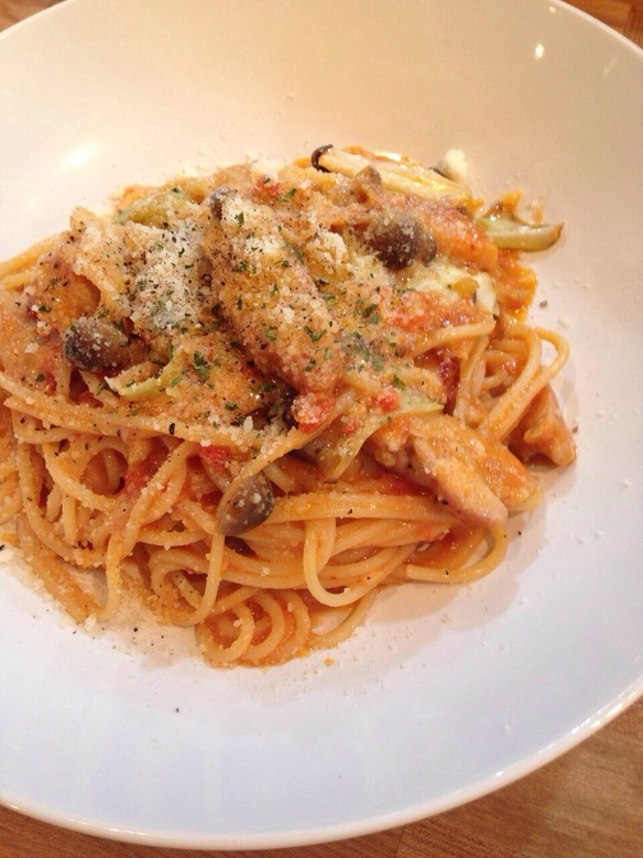 本日の日替わりパスタは『チキントマトクリームパスタ ¥830』です。