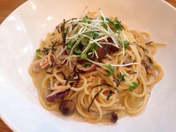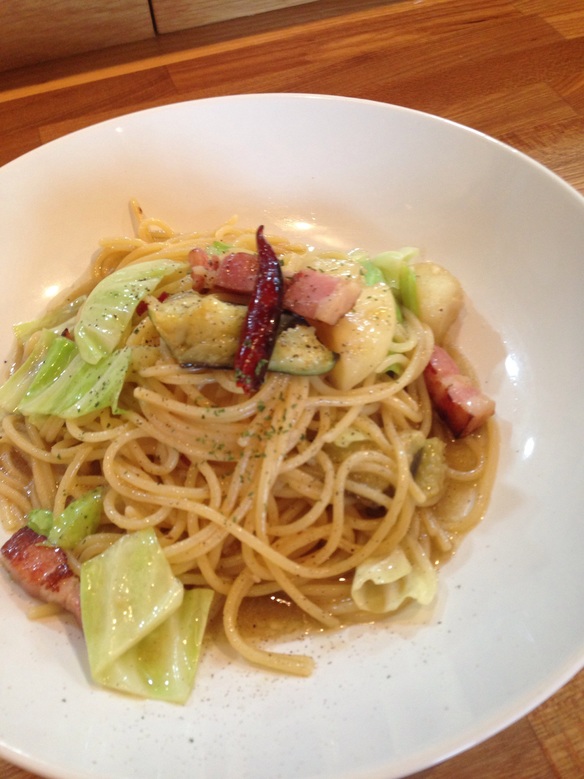 が入ったオイルベースのパスタ。急に肌寒くなった今日はニンニクの効いたペペロンチーノをどうぞ。。