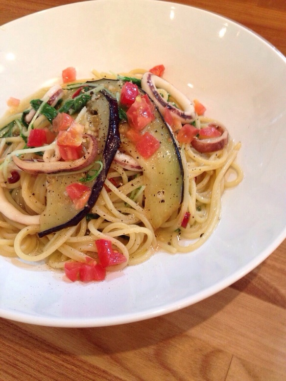 イカ・アサリ・しろ茄子・きのこ・茗荷・貝割れ・水菜、、と、とっても具沢山で贅沢な一皿。ぜひお試しくださいね。