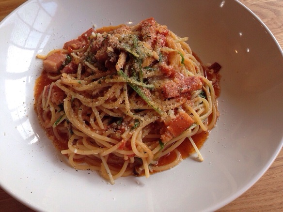 本日の日替わりパスタは『ベーコンときのこのトマトソースパスタ ¥830』です。ぜひお試しください。