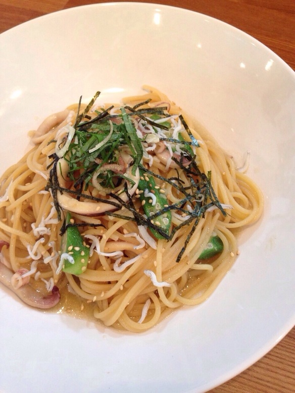 さてさて本日の日替わりパスタは『イカとオクラの和風パスタ ¥830』です。本日も暑いですね。そんな日には、少し塩分の効かせたパスタをご用意してお待ちしております。ぜひお試しください。