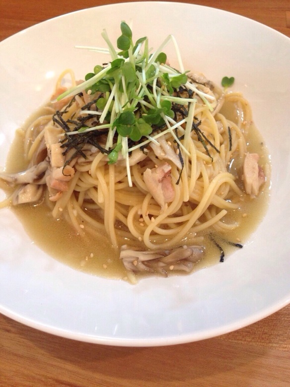 お醤油がほんわか香るソースのパスタに、カイワレを飾ってピリリとアクセント。あっさり食べられるパスタをぜひお試しください。