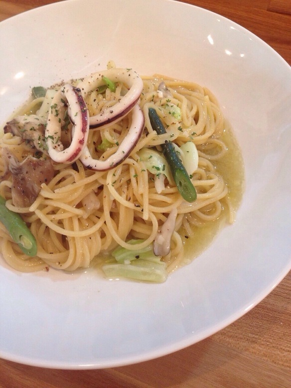 さて、本日の日替わりパスタは『イカと野菜の塩ガーリック ¥830』です。具材に舞茸、インゲン、キャベツと野菜をたっぷり入れました。ぜひお試しください。
