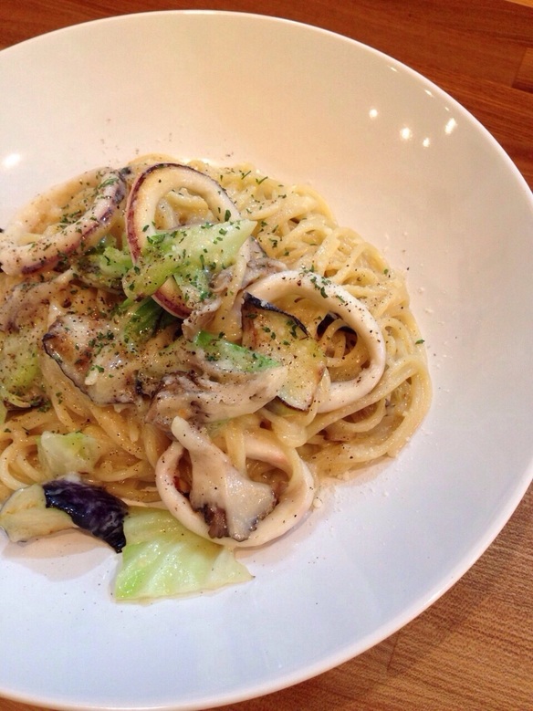 揚げナス、キャベツ、舞茸とイカの入ったクリームパスタはボリュームたっぷりで食べ応えのある一皿です。ぜひお試しください。