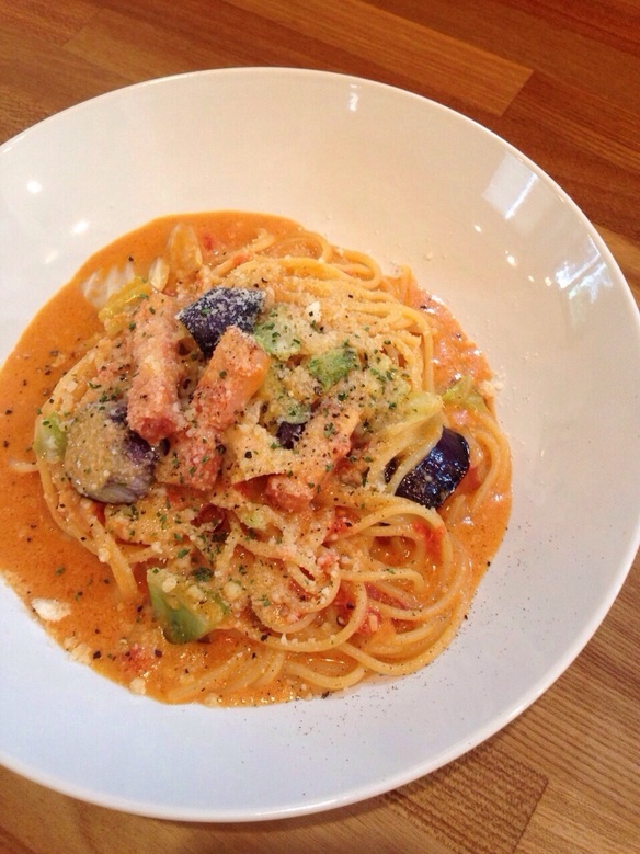濃厚なトマトクリームソースに相性抜群の茄子とベーコンとチーズ。しつこくなり過ぎないようキャベツを加えました。ぜひお試しください。