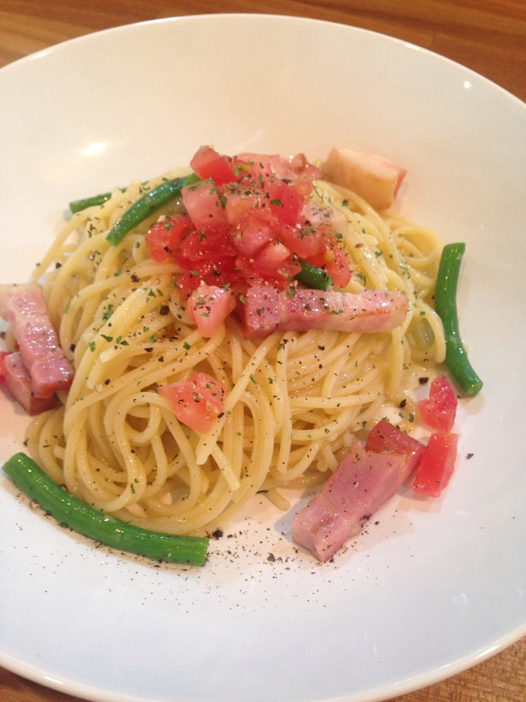 本日の日替わりパスタは『ベーコンとインゲンのペペロンチーノ ¥830』です。