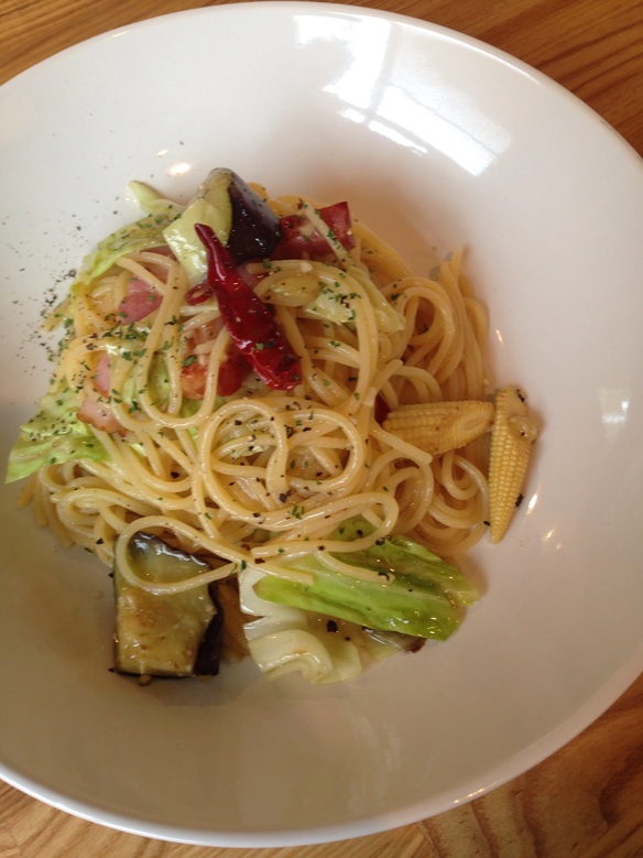 本日のランチパスタは『お野菜ペペロンチーノ ¥830』です。キャベツ、なす、ヤングコーン、ベーコンがゴロゴロと入っているペペロンチーノ。ぜひお試しくださいね。