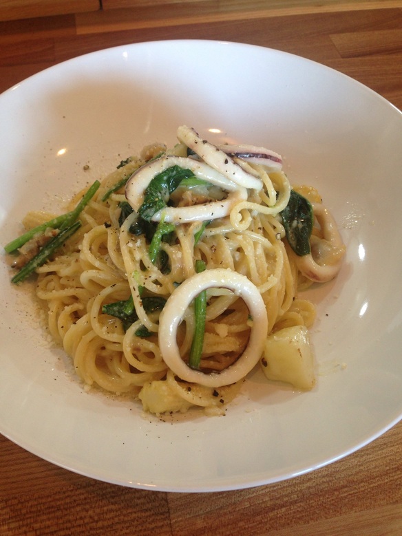 本日のランチパスタは『グリーンパスタ ¥830』です。クリームジェノベーゼソースにキャベツ・ブロッコリー・ほうれん草・イカを入れました。緑が沢山入ったパスタをぜひお試しください。