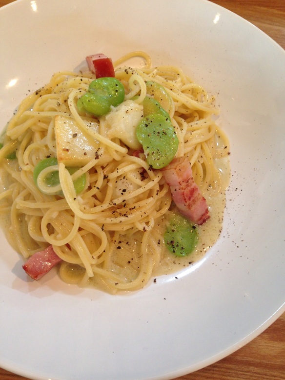本日の日替わりパスタは『そら豆とベーコンの塩クリームパスタ ¥830』です。ぜひお試しくださいね。。