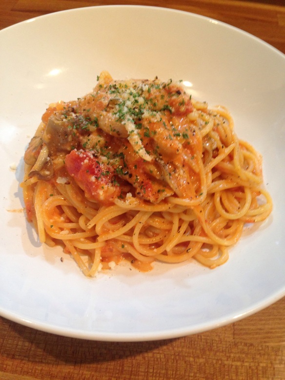 さて、本日の日替わりパスタは『チキンと舞茸のトマトクリームパスタ ¥830』です。具材と麺にしっかり絡むトマトクリームソースは、優しい味わいに仕上げてます。ぜひお試しくださいね。