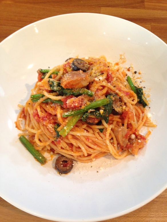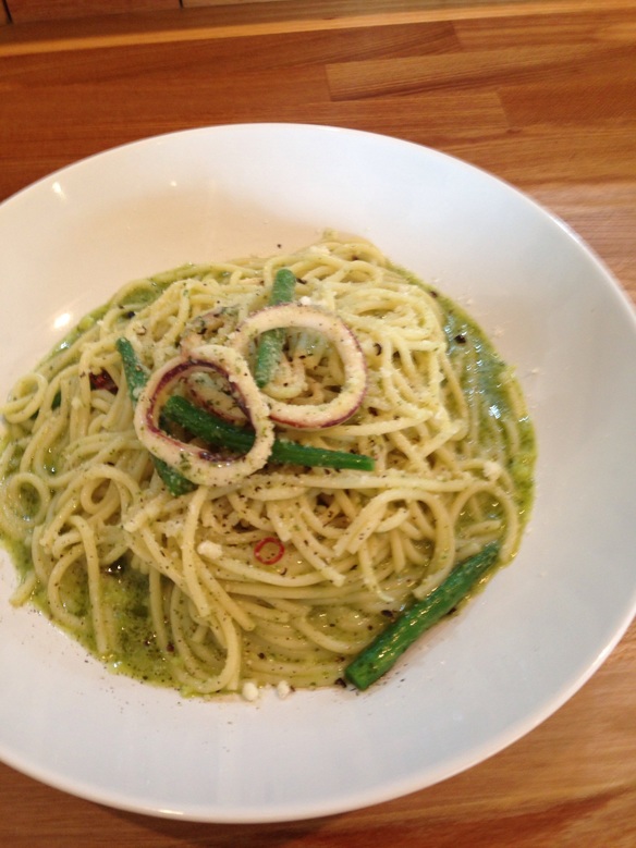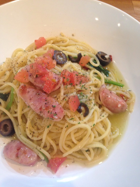 写真は本日の日替わりパスタで『粗挽きソーセージとほうれん草のペペロンチーノ ¥830』です。