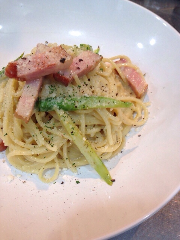 写真は本日の日替わりパスタです。『アスパラとベーコンの塩クリームパスタ ¥830』