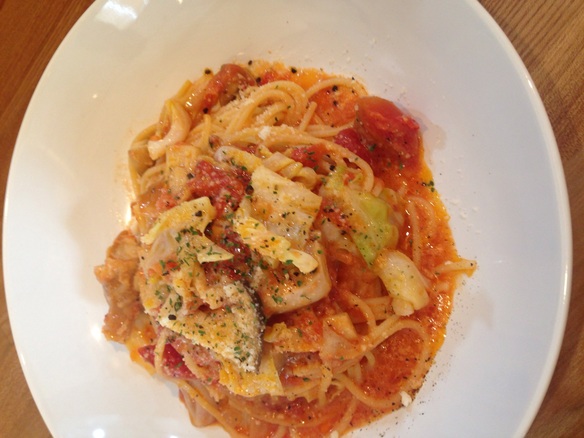 さて本日のランチパスタですが『チキンときのこのトマトクリームパスタ』です。ぜひお試しくださいね。