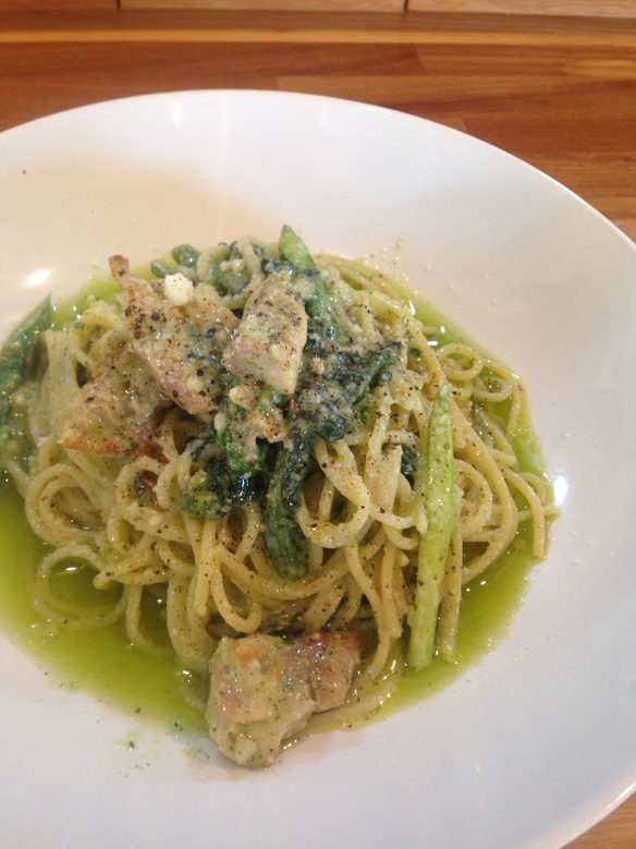さて本日のランチパスタですが『チキンとアスパラのジェノベーゼ ¥830』をご用意しています。オイルベースのソースですがバジルの爽やかな香りが今日の1日にびったりです。ぜひお試しくださいね。