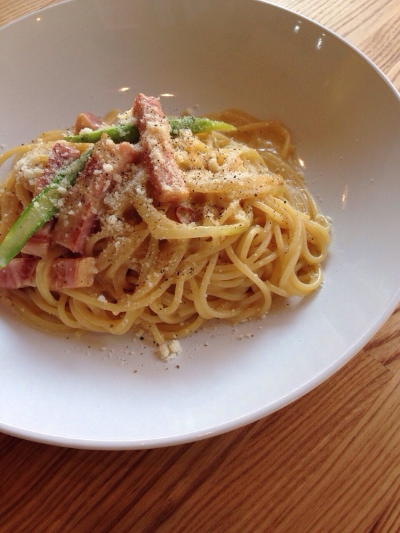 写真は今日の日替わりパスタ『ベーコンとアスパラのカルボナーラ ¥830』です!濃厚なカルボナーラに春の野菜を加えて食べやすく仕上げています。ランチには全てミニサラダもセットになっていてお得です‼︎