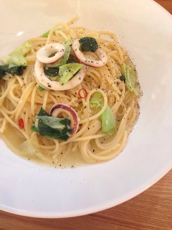 さて、写真は今日の日替わりパスタです。『キャベツとイカのペペロンチーノ¥830』