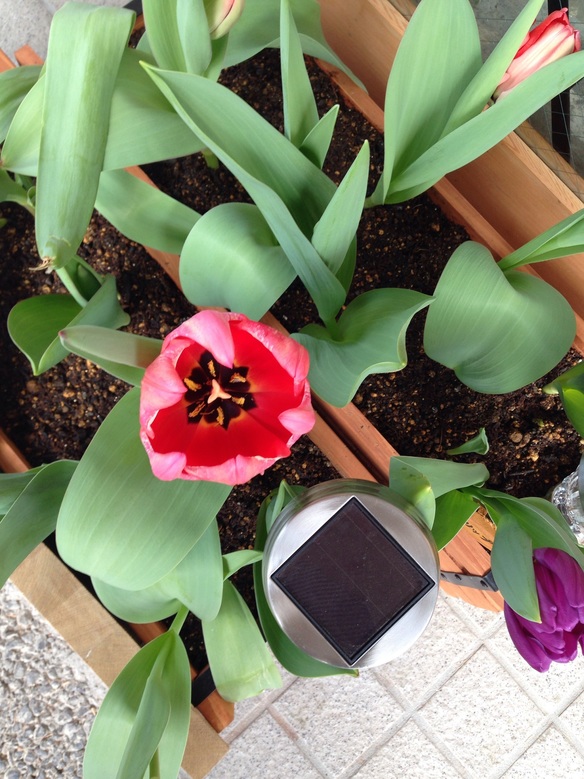 今日は曇り空で、少し肌寒いですね。けれども、入り口にあるピンクと紫のチューリップはもうすぐ咲きそうです。綺麗に植えたつもりが色んな方向に伸びていて、、自由に成長してます。。笑