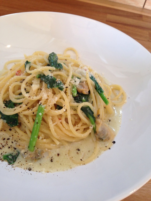 『アサリとほうれん草のクリームパスタ ¥830』こっくりとしたクリームソースに具材とパスタが絡んで濃厚な味わいです。後から柚子胡椒の辛みが爽やかに鼻に抜ける一皿にしあげました。